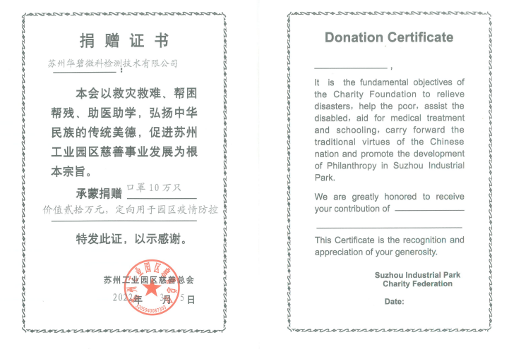 2022年2月25日,蘇州華碧微科檢測技術有限公司向蘇州工業園區慈善總會捐贈價格20萬元的防疫物資用于抗擊疫情。
