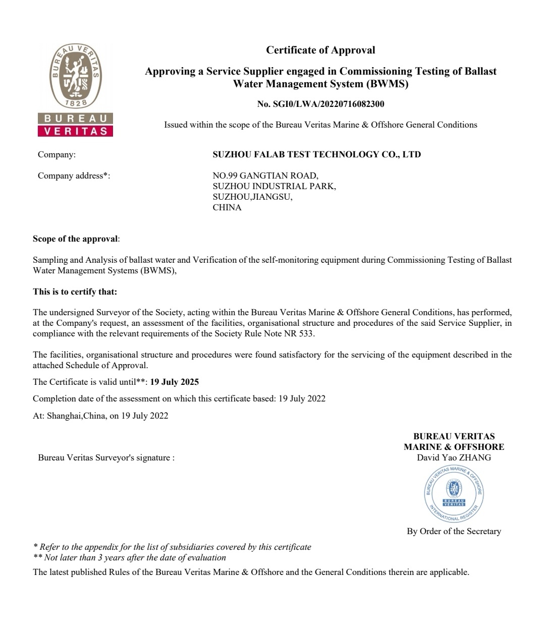 7月中旬,華碧(FALAB)通過了法國船級社(BV)的認(rèn)證,成功取得其壓載水管理系統(tǒng)調(diào)試試驗(yàn)(BWMS)資質(zhì)認(rèn)可,提升了華碧(FALAB)在壓載水檢測領(lǐng)域的服務(wù)能力。