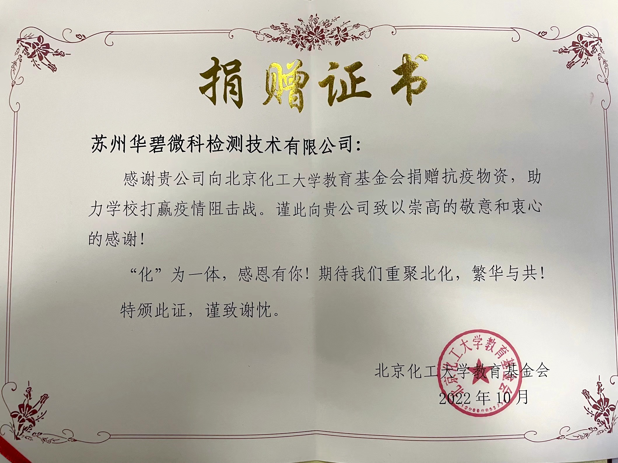 近日,北京化工大學教育基金會為蘇州華碧微科檢測技術有限公司頒發了捐贈證書以及感謝信,對我司在該校疫情防控工作中給予的支持表示感謝,對企業高度的社會責任感表示贊許。