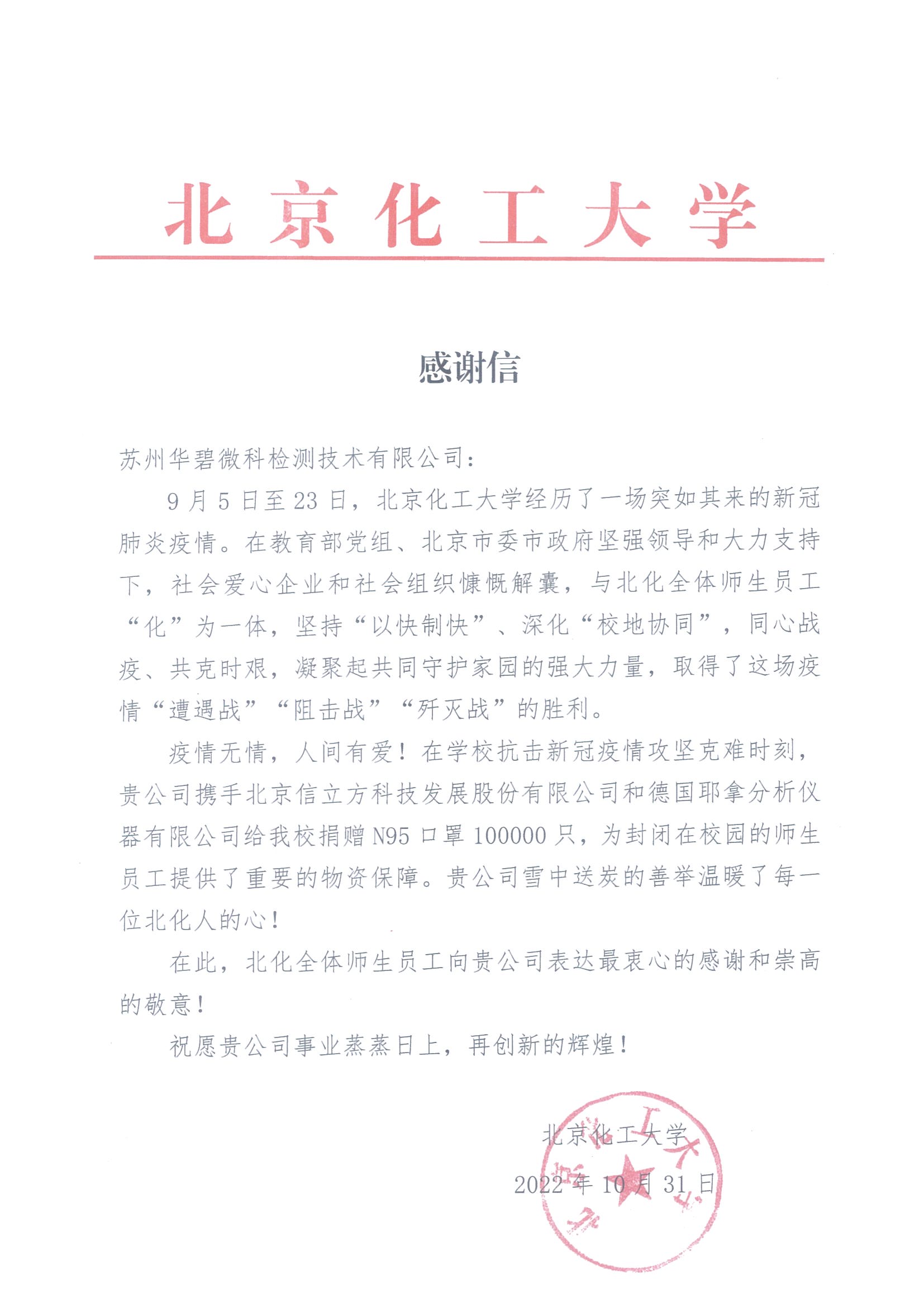 經過努力,蘇州華碧微科檢測技術有限公司克服重重困難,確保物資及時送達北京化工大學并順利完成物資交接。當前全國疫情多點散發,形勢嚴峻復雜,蘇州華碧微科檢測技術有限公司希望通過此次捐贈發揮企業優勢為校園疫情防控工作助力,為師生健康安全增添一份保障。