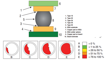 C假如斷裂發生在BGA錫球的中間,要繼續觀察其斷面為圓弧面、光滑面、粗糙面、平面,如果是光滑的圓弧面,就有可能是HIP(Head-In-Pillow,枕頭效應),相反的就比較偏向外部應力引起的開裂。