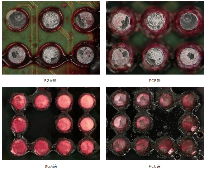 染色試驗的原理是利用液體的滲透性,將焊點置于紅色染劑中,讓染料滲入焊點裂紋,干燥后將焊點強行分離,通過觀察開裂處界面顏色狀態來判斷焊點是否斷裂。紅墨水試驗可以檢驗印刷電路板上BGA及IC的焊接情況,通過觀察、分析PCB及IC組件的焊點染色情況,從而對焊接開裂情況進行判定。如果焊接的球形出現了紅色藥水,就表示這個地方有空隙,也就是有焊接斷裂,由焊接斷裂的粗糙表面來判斷是原本的焊接不良,或是后天不當使用后所造成的斷裂。