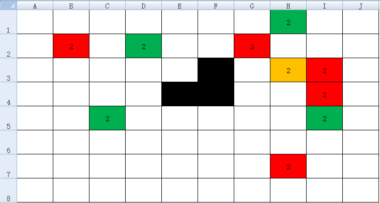 對于存在染色的器件,試驗結果一般選用如下圖1所示的“染色點位分布”來呈現。其中,方格表示器件所有焊點的分布;黑色方格表示此處不存在焊點;白色方格表示此處焊點無異常不存在染色;綠、黃、橙、紅方格表示此處焊點存在染色(不同顏色代表不同染色面積占比,如下圖2);方格內數字(1、2、3、4、5)表示此處染色焊點的斷裂模式(如下圖2)
