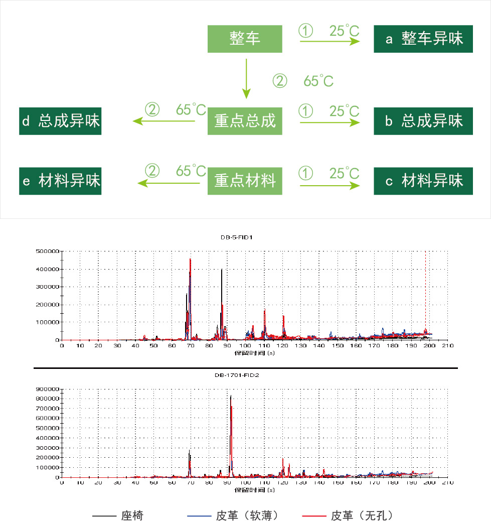 通過整車特定部位小范圍加熱測試其揮發物,確定重點總成;重點總成與重點材料均經過常溫、高溫測試。